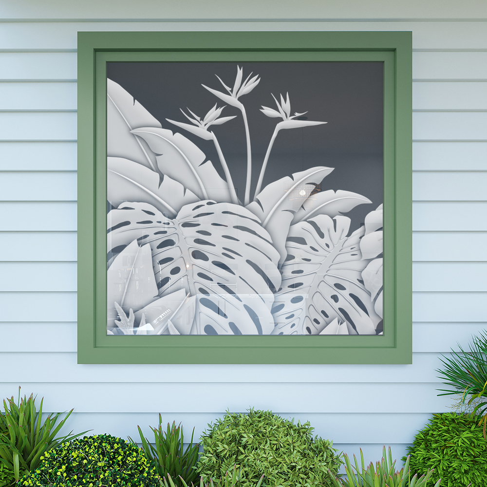 Add an aesthetic touch and varying degrees of privacy to your glass windows and doors with Kaholo’s tropical designs. Get the look of real sand-blasted or acid-etched glass at a fraction of the cost! While our product looks like the real thing, it’s ecologically safer and cleaner than sand-blasting and acid-etching, and it’s replaceable because it doesn’t permanently damage the surface of your glass (does not permanently mar the glass).