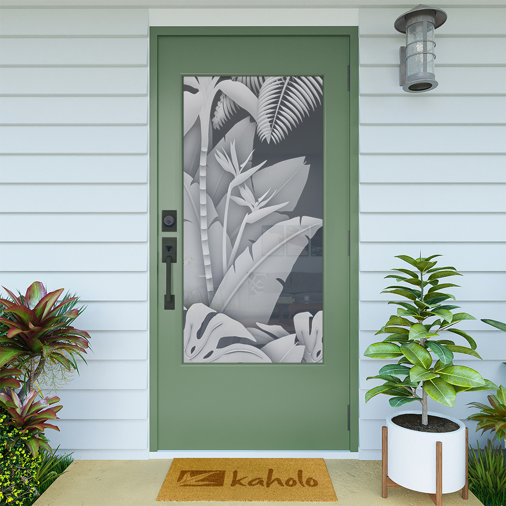Kaholo’s DIY designs are created using the window film industry’s best, most durable window film materials, designed by experienced artists and manufactured with the latest large format printers. The level of detail halftones and gradient shading is clearly represented in every piece of art and seldom found in the industry. Perfect on any door, kitchen cabinet, sidelight, picture window, pantry door, shower door, bathroom mirror and more – get creative! Get tropical! Get Kaholo Glass Art!