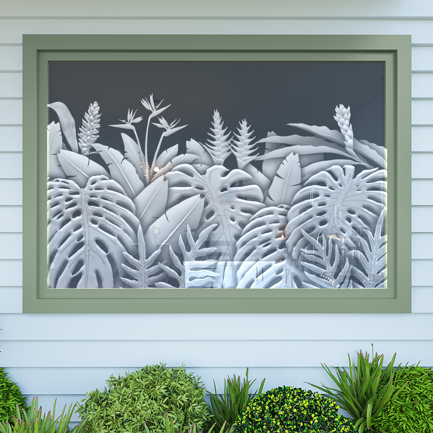 Add an aesthetic touch and varying degrees of privacy to your glass windows and doors with Kaholo’s tropical designs. Get the look of real sand-blasted or acid-etched glass at a fraction of the cost! While our product looks like the real thing, it’s ecologically safer and cleaner than sand-blasting and acid-etching, and it’s replaceable because it doesn’t permanently damage the surface of your glass (does not permanently mar the glass).