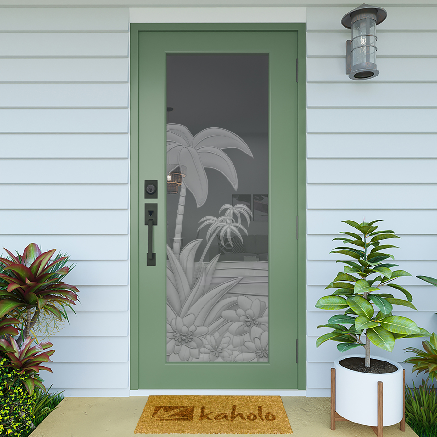 Kaholo’s DIY designs are created using the window film industry’s best, most durable window film materials, designed by experienced artists and manufactured with the latest large format printers. The level of detail halftones and gradient shading is clearly represented in every piece of art and seldom found in the industry. Perfect on any door, kitchen cabinet, sidelight, picture window, pantry door, shower door, bathroom mirror and more – get creative! Get tropical! Get Kaholo Glass Art!
